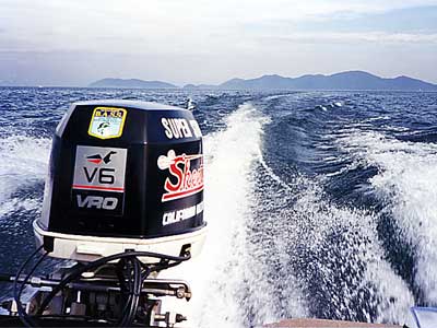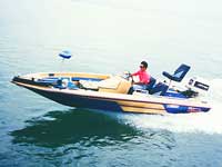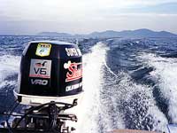 次ぎは、スクリュー、属にペラと呼ばれていますが、ペラにも幾つかの種類があり、ピッチ(角度)のきついものから緩いもの5枚羽のもの迄、数多く市販されています。スクリューを選ぶ場合は先ず回転数に応じたものを選ばなくてはなりません。抵抗が大きく回転数が上がらなかったり、回り過ぎるスクリューもエンジントラブルを起こす事があります。 もう一つ知っておかなければならないのは水にも粘度、即ち粘りがあると言う事です。以前、外国通販のカタログでスクリューを輸入した際、カタログデータとは全く違い、使い物にならなかった事がありました。やはり、アメリカ本土の湖と琵琶湖とではかなりの違いがある様です。 スクリューの使い分けとしては、プレーニングを早くするのであればピッチのゆるいペラを、速度を上げるのであればピッチのきついペラが必要であすが、中にはチョッパータイプのペラや5枚羽のペラも有りますが、これらのペラも回転数に上手くフィットすればトリッキーなパワーが得られます。 その他にも、抵抗を更に少なくする、ノーズコーンと呼ばれる競技用パーツ等もあります。 要は、水の抵抗を最小限に減らし尚且つ回転数に合ったピッチのスクリューを選ぶ事なのです。 後は、ボートを操船するドライバーの腕にかかってきますが高速走行するには、それなりのテクニックも必要です。 200馬力クラスのバスボートになると、ペラに受ける水の抵抗はかなりのもので5,000回転を越えると、まるでロックされた様にハンドルが動かなくなります。その為ハンドルを切るには、そこそこの腕力が必要です。両手を使わなければならない為、アクセルはフットアクセルに変えた方が良いでしょう。 又、冬場にバスボートを使用する時は、必ずグローブとフルフェイスのヘルメットを忘れずに。