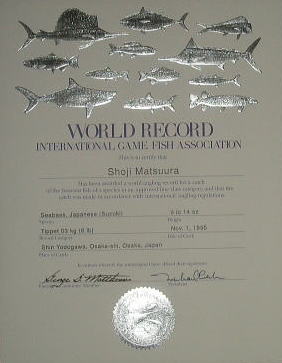 今のところ私の知っている範囲ではアメリカ合衆国のフロリダ州に本部のあるIGFA(インターナショナルゲームフィッシュアソシエイション)という団体がある。IGFAの主な活動は、ゲームフィッシュ、すなわち水産資源としての魚ではなく、釣りの対象魚を調査研究し、ある一定のルール(IGFAルール)によって1匹の魚とフェアーにファイトし、釣り上げられた魚のみ世界記録として認定管理している。基本的理念は、1匹の魚とフェアーに渡り合うと言う事で釣り人に有利になる様な釣り方は認められていない。このIGFAルールと言うのは、解り易く言えば、記録認定の為にインターナショナルゲームフィッシュ協会が独自に定めたところの世界共通のスポーツフィッシングルールで、世界記録の認定の他に、世界各国で開かれるスポーツフィッシング大会にも、このIGFAルールが採用されている。それでは、IGFAがどのように釣魚の記録を認定しているかと言うとこれが非常にややこしくも的を射た申請基準となっている。単に魚拓や魚とメジャーが同時に写っている写真を提出すれば済むものではない。写真を提出するのは同じであるが、釣魚をラインの強度別に評価している為、実際に使用したラインも提出しなければならない。それと、専用の記録申請用紙と言う物があり、この申請用紙を見ると、どれ程記録を認めてもらう事が大変な事か解る。まず、釣った魚の重さで評価する為(この時点で日本とは考え方が違っている)魚を計っている計りと一緒に写した写真がいるのと、その計りが正確に作動しているのかどうかの証明と公証人まで立てなければならない。それに、タックルについても事細かく記入する欄があり、1つでも抜けていると記録としては認められない。最後には、この申請書に偽りがないのかのサインまでさせられて、初めて申請書を提出し、後はIGFAの本部で提出されたラインのブレークテストを行い。そのラインが申請した強度内で切れると晴れて、世界記録となるわけである。