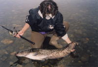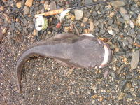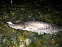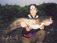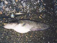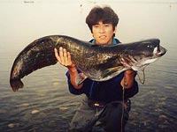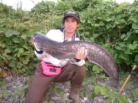 ビワコオオナマズは、日本にいるナマズ類中最大と言うだけでは無く、純日本産の在来淡水魚の中でも最大と言う事になります。過去に私の釣った最大級のビワコオオナマズは、1998年6月に湖東で釣った推定23kgで20kgバカリの針を振り切って、しかも尾が地面に着いていました。しかし、昔から琵琶湖で漁をされている知合いの漁師さんは、過去に30kgを超えるビワコオオナマズがエリに入った事があると、言っていました。果たして、最大のものはどれくらいになるのでしょうか?ビワコオオナマズは、普段、湖底の水深30〜50mくらいの岩礁の間に潜み日が暮れると湖の中層、稀に表層に現れ活発にエサを獲る様で、岸近くにも回遊してくるが、冬場は殆ど浅場には現れる事は無い様です。食性はかなり荒く、過去に釣った1mを超えるビワコオオナマズが吐き出した物には、40cmクラスのブラックバスや30cmクラスのニゴイ等がありました。又、漁師さんの話によると、沖合いに仕掛けたビワマスを獲る刺網に稀にビワコオオナマズが掛かる事があるそうで、しかも網に掛かったビワマスがビワコオオナマズに噛まれていると言う話を聞いた事があります。敏感なビワマスを食うぐらいだから、かなりの高速で泳ぎ回っていると考えられます。ビワコオオナマズの産卵は、6〜8月頃の大雨の降った後の濁った湖岸に集団で接岸し、メスの体にオスが巻き付く様に産卵します。1mを超えるのは殆どがメスで、オスはせいぜい80cm位と言った所です。多い時には、100匹を超えるビワコオオナマズが一斉に接岸する事もありますが、近年湖岸工事の為か、昔に比べ接岸する数が少なくなっている様な気がします。ビワコオオナマズにも幾つかのタイプがあり、場所によって独自の生態を持っている様です。