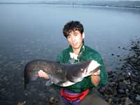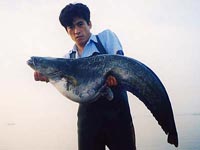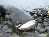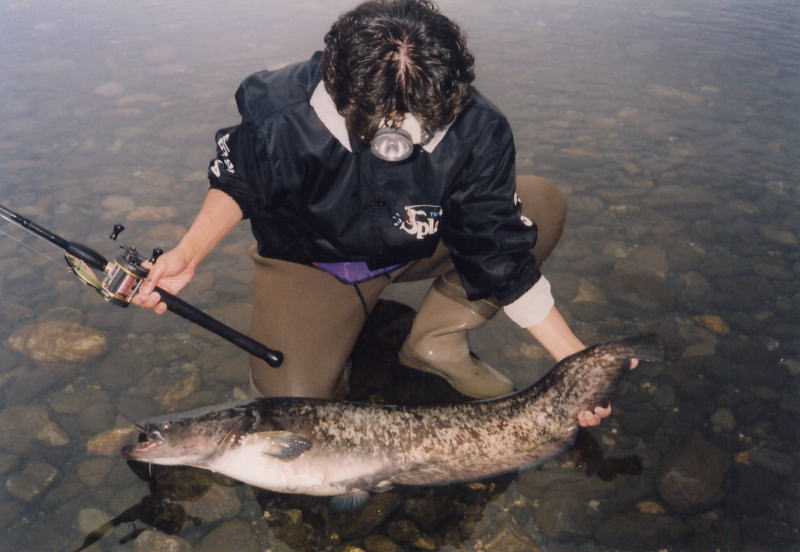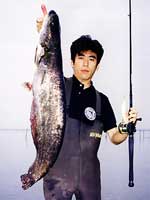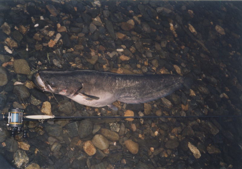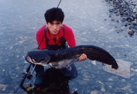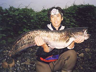 ビワコオオナマズ(Silurus Biwaensis)は、琵琶湖と瀬田川・宇治川・淀川等に生息していますが、琵琶湖本湖に生息しているビワコオオナマズには、大きく分けると2つのタイプがある様です。瀬田川・宇治川に住むビワコオオナマズにも、幾つかのタイプ?があると言われてます。琵琶湖の本湖に住むビワコオオナマズは、湖北の深場を棲み家とする「湖北型?」と沖ノ島周辺から湖東にかけて生息する「湖東型?」の2つに分れます。湖北型は、安曇川から奥手湾にかけて多く生息し、普段は沖合の30〜50m位の湖底に住んでいて、夕暮れから朝にかけては、かなり沿岸に接岸する様です。この事は、湾内の浅場に仕掛けられているエリに時々ビワコオオナマズが入る事からも立証されています。又、漁師さんの話によると、竹生島の沖に仕掛けられたビワマスを捕る網にも時々ビワコオオナマズが掛かり、ビワマスがビワコオオナマズに噛まれて、無残な姿になっているそうです。普段は、深い湖底に潜むビワコオオナマズも夜になるとかなりの範囲を行動し、それだけの魚体を維持する為に相当量の餌を摂取している事に間違い無いでしよう。「湖東型?」は、湖北型に比べると幾分浅場を棲み家とし行動範囲も狭い様に思われます。沖ノ島周辺では、4月上旬から狙って釣る事が出来ますが、やはり、湖北に比べると水温の上昇が早い為と考えられます。それに、バスフィッシングの最中に外道として釣れる事がよくあります。