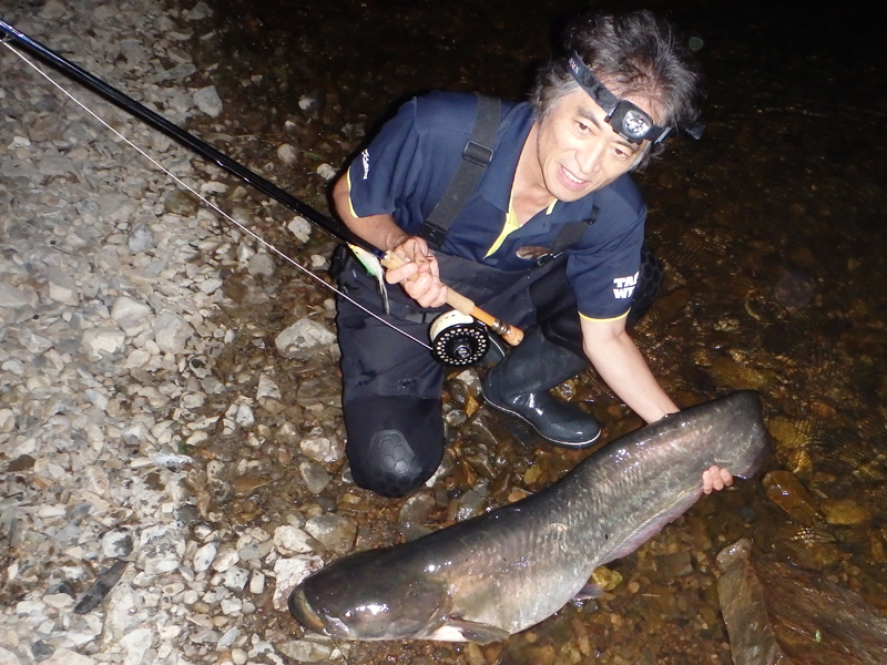 普段は、湖底の水深20〜50mに住んでいますが夜になると中層若しくは表層に迄浮上し餌をあさります。従って、狙う時問帯も夕暮れから明朝迄となります。しかし、瀬田川や宇治川の様な河川では、しばしば大雨で濁りが入りこの様な時は日中でも狙う事が出来ますが、琵琶湖の本湖で狙う時は、予め回遊してくるポイントを絞らなければなりません。広い琵琶湖に向かって闇雲にキャストしてもビワコオオナマズに当る確率は殆ど無いと言って良いでしょう。