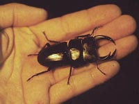 オオクワガタ(Dorcus curvidens binodulus)には、それぞれ産地によって個体差がある事は知られています。オオクワガタの産地として有名なのは本州では山梨県と大阪府で、特に大阪府の北部から京都府にかけての山に生息するオオクワガタは、アゴ(ハサミ)が太く大きい為美形と言われています。中部地方や山陽方面にいるオオクワガタは、ハサミが細く横に湾曲した個体が多いと言われています。しかし、中国大陸に生息するオオクワガタは何故か大阪府産に近いハサミを持っています。又、数は少なく幻のオオクワガタ?と迄言われている紀伊半島産のオオクワガタは、腹側に金色の毛が多く生えています。十数年前にクワガタマニアからヨシノオオクワガタと呼ばれていた個体が、この紀伊半島産という事です。オオクワガタをブリードすると良く解るのが、必ずしも親虫が大きければ子も大きくなるとは限りません。要は、成長する過程において、どれくらい良い条件が揃っているかと言う事です。オオクワガタの場合、自然界では3令虫で始めて成虫となりますが、1〜3令に掛けてどれだけエサを食い、栄養を摂取するかによって既に幼虫の大きさが違い、当然成虫になっても大きさが違っています。オオクワガタが生活と繁殖の媒体にしているクヌギやナラの木は落葉広葉樹に属しますが、ナラとクヌギとでは自生している場所が少し異なります。ナラは、ミズナラやコナラと同じくクヌギに比べると、やや高地に自生しています。クヌギは、シイやカシワの木と同じで、低い丘や里山に多く生えています。オオクワガタは、ナラの木よりもクヌギの木を好むと言われていますが、この事から言うとオオクワガタは、余り高い山には少なく低い山の方が多くいると言う事になります。経験上、これは言えると思います。余り高い山で採取した事はありません。おそらく、媒体になるクヌギの木は低い場所に多いと言う事でしょう。