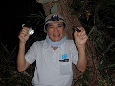 オオクワガタ採りは夜に行動する為、安全面を考えなくてはなりません。先ず、ライトは必需品ですが、手で持つ懐中電灯よりもヘッドランプの方が使い易く、ライトを点けたまま両手を使う事が出来ます。それに帽子も必要で、木の上から落ちてくる毛虫などから頭を守ります。足元は、必ず靴を履き長ズボンを着用する様にしましょう。夜は昼間と違い毒の有る虫も出てくる為、当然長袖も必要です。又、木に触れたりする時は必ず薄いゴム手袋が必要です。間違って、毛虫やムカデに触れたりすると大変な事になります。その他、汗を拭くタ才ルや防虫スプレー。初めて入る山では、方位破石等もあると便利です。次に、オオクワガタを捕る時に使う道具の必需品としては、穴の中を見る為のペンライトや穴の中からオオクワガタを引き出す為の金属棒等も必要です。白転車のスポークの先をL字型に曲げたものが使い易いでしょう。最後は捕ったオオクワガタを写真に収める為のフラッシュとカメラが必要です。写真を撮った後は元の木に逃がしてやりますが、記録を取る為のメジャーかノギスがあれば便利です。それに、1人では森に入らず必ず二人か三人で行動する様にしましょう。