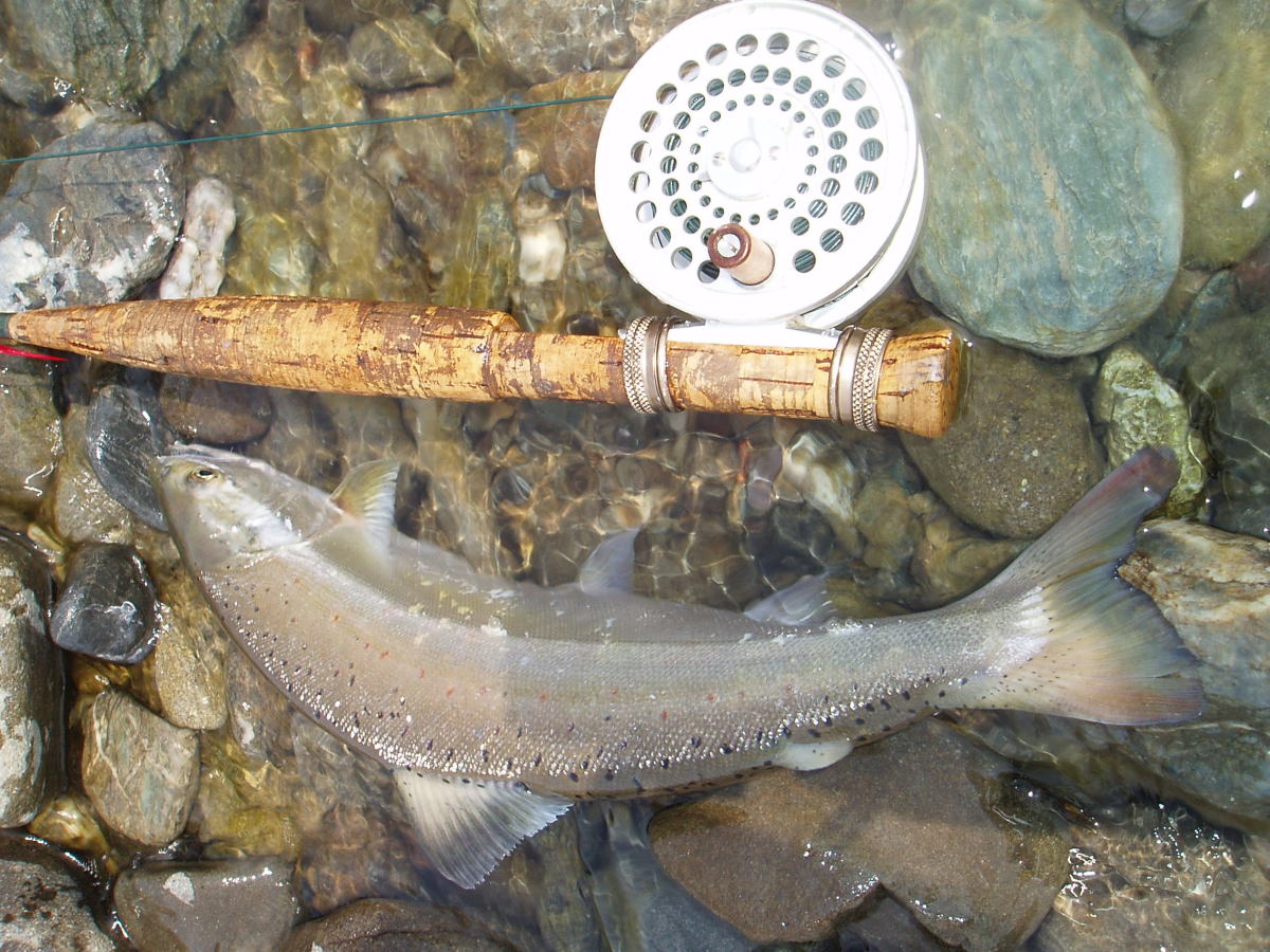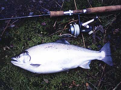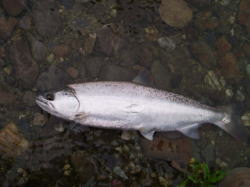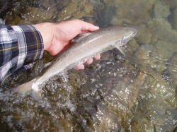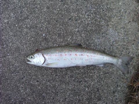 サツキマスはアマゴ(0ncorhynchusrhodurus)の降海型で、主に太平洋側に注ぐ河川に生息し、上流域から海迄の間を回遊するとされています。それでは、同じアマゴでも海に下るタイプと河川内に留まるタイプとは、何処が違うのでしょうか?一説によると、縄張り争いに負けたアマゴが新たなテリトリーを求めて降海し、再び繁殖の為に川を遡るとも言われています。 しかし、ここ数年放流事業が盛んで各地の河川にアマゴが放流されています。放流アマゴの殆どは、養殖生産された固体で、本来その河川に生息していたものではありません。 けれども、放流されたアマゴの中の何匹かは、川を下り海へ入った後再びその川へ戻っているのも事実です。これは、アブラビレをカットして放流する調査でも確かめられています。やはり、サツキマスもサクラマスも生れた時から遺伝子によって降海するものと河川に留まるものがあるのでは?と考えられます。伊勢湾に注ぐ長柄川では、昔からサツキマスを専門に狙う川漁師さんが居ますが、その漁師さんの話によると、サツキマスにも幾つかのタイプがあり川を下った後、伊勢湾を回遊し再び川に戻ってくるタイプが本当のサツキマスで、川を下っても河口近くで留まっていて伊勢湾を回遊せず川を上るタイプ、それに河川内で上流と下流を行き来しているタイプとがあり、それぞれ体型が異なるそうです。長柄川の川漁師さんは、伊勢湾の沖を回遊し、再び遡上してくるサツキマスは全て40cmを超えており、中には60cmに達するものもいると言います。又、このタイプの個体は全身が白銀色でウロコが剥がれ易く体高があり、顔がいかついのが特徴で見かけにはアマゴの特徴である朱点は見えませんが、ウロコを全部剥ぎ取ると朱点が現れると言います。もう1つの河口付近に留まる個体は、さほど大きくはならず30cmクラスが最も多いと言う事で、早い時期から遡上が始まるそうです。 この個体は、全身が白銀色のウロコで覆われていて朱点も外部から確認出きるそうです。それに、頭に丸みを帯び、顔もいかつくないとの事。もう1つは、俗にギンケヤマメならずギンケアマゴと呼ばれているタイプで、海には下らず河川内の深みに留まって1年を過ごすタイプで、やはりウロコが剥がれ易く外部から朱点が確認され尾ビレや背ビレがアマゴの特徴である黄色味がかった色をしています。このタイプに体高のある個体な無く、春先に河川域に多いそうで、稀に40cmクラスのものもいるそうです。長柄川の漁師さんの話が本当ならば、サツキマスは40cmを超えなければサツキマスとは言えない事になります。何年か前にある雑誌でこの事が取上げられた事がありますが、その雑誌にもサツキマスと長柄マスそれにアマゴマスがいるのでは?と書かれていました。ここ近年、長柄川でもアマゴの放流が盛んになるにつれて、サツキマス以外のタイプ?が増えている事、この話から言うと、紀伊半島や瀬戸内に流れ込む河川で釣れる30cmクラスは、本当のサツキマスでは無いのかも知れません。