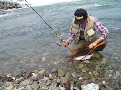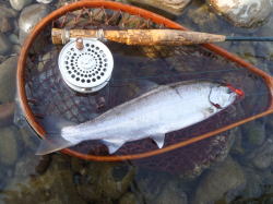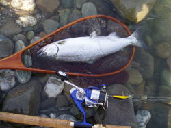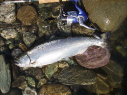 基本的にはトラウトロッドで十分ですが、ポイントによっては川幅があり、流れのきつい場所もあります。こう言った場所では、幾分タックルもヘビーになります。比較的小さなミノーやスプーンをキャストする為、スピニングタックルが使い易くラインもルアーの動きを考えて8ポンド位迄で良いでしょう。トラウトロッドとして市販されているものには、5フィート位の渓流専用のロッドから、9フィート前後の本流用、若しくはサクラマス専用ロッドがありますが、ポイントに合わせてロッドを選ぶ事が大切です。ルアーは、バランスの良い小型のミノーとスプーンがメインとなりますが、時期によっては小型のジグヘッドにミニグラブを付けて狙う事もあります。 特に、中流域から上流域に達した頃のサツキマスは、食性が変わるせいかソフトルアーに良く反応します。ミノーで狙う場合は、4cm位から9cmのサイズを選びます。タイプはフローティグとシンキングの両方揃えておいた方が良いでしよう。サツキマスは、数匹の群れで瀬に付いている事もあり、そう言った場所ではフローティグのミノーが威力を発揮します。逆に、川の淵のトロ場では、シンキングミノーやウェイトのある肉厚のあるスプーンに分があります。