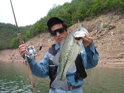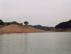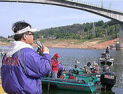 AM7:00、各ボートは、いっせいにポイント目指して、走り出しました。久々のバストーナメントでしたが、雰囲気は、まるで兵庫県の東条湖と言う感じでした。思い出せば私もかつては、バストーナメンターとして、数々のトーナメントに参戦した経験があり、なんとなく懐かしく感じていました。しかし、今回は、ソガリを釣る為のタックルしか持ち合わせていなかったのと6ポンドラインでのバストーナメントは少々キツイ感じがしました。けれどもパートナーが良かったのか安東湖がよく釣れる湖だったのか解りませんが、クリークを周るごとにグッドサイズのバスが次々と釣れました。丁度、この頃から私もトーナメンターの感じが戻ってきた様な感じで、昼過ぎには、パートナーを軽く上回ってしまいました。しかし、よく考えると、私の場合、韓国へ来た目的は、バスではなく、ソガリを釣る為で、出来る事ならソガリ狙いに変更してもらいたかったのですが、パートナーに上手く言葉が通じないのと、たぶんパートナーは、バスがよく釣れるので、これで私が満足していると思ったようです。結局トーナメント初日は、バスがだけで、目的のソガリを釣る事は出来ませんでした。ところがこの日、他のボートでは、ガイドがソガリを釣ったとの事。そこで翌日はソガリオンリーと心に決めたのでした。この日の夜に開かれた親善のパーティーでパートナーに明日は、ソガリオンリーにしたいと通訳の人を通じて、話してもらいました。パートナーは、かなり難しい顔をしていましたが、努力してみましょうとの返事。