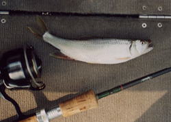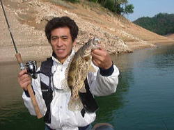 そして、2日目の朝を迎えました。スタートして約20分程走ったクリークの入り口でパートナーが指を指し、「ソガリエリア」と言うのでさっそく小型のミノーをキャスト。すると岩陰から何やら見慣れない魚がルアーを追って来るのが見えました。もしかして、ソガリ?そこでワンサイズ小さいミノーに交換し、ゆっくりと岩陰をトレースした時、ついにヒット!30センチクラスの小型のソガリだったのですが、初めて釣ったソガリに大変満足してしまいました。やはり思った通りで、ソガリも日本にいるオヤニラミと同じで、ストラクチャーにテリトリーを持つタイプの魚である事が解ったような気がしました。そしてポイントを変えた2投目、またもヒットと思いきや何だか軽々しい引き味。なんと釣れたのは琵琶湖名物のケタバス。こんな所にまで来てまさかケタバスを釣るとは・・・・ケタバスは、琵琶湖の特産種と聞いていたのに・・・・続いて、今度は、グッドサイズのブルーギル。まあこれくらいは居てもおかしくない。そして、クリークを出て、次のポイントへ着いての一投目。今度は、少し重量感のあるファイト。4ポンドラインを使っている為、慎重にやり取りし、今度は、40センチクラスのソガリをゲット!パートナーも大変うれしそうでした。後から聞いていた話だと、ソガリが釣りたいと言う私の為に前日にポイントを調べ、情報を聞いておいてくれたそうです。パートナーに感謝ってところです。2日目は、2匹のソガリとブルーギル、ケタバス、ブラックバスと4種類の魚をゲット。結局、2日間のトーナメントで、ブラックバスのポイントにソガリのポイントを追加して、総合で私が優勝してしまいました。オマケに賞金までいただき、何とか韓国まで来た目的を果たせました。もちろん賞金は、全額タグ&リリース基金に寄付させていただきました。
