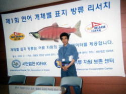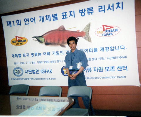 朝鮮半島に<ソガリ>という魚がいる事を知ったのは16歳の時、家業が印鑑造業を営んでおり、印章彫刻の職人さんに韓国人の人がいて、その人から韓国では、ソガリは、食用として珍重されていて、高級食材にも使われている事を聞いていました。しかし、その当時(1974年頃)は、ようやく関西でも兵庫県の東条湖でブラックバスが釣れ出した頃で、韓国にソガリを釣りに行く人等、ほとんどいませんでした。けれども韓国を代表するゲームフィッシュと言う事でいつかは釣りたい・・・・と思っていました。初めてソガリを見たのは、滋賀県の大津にある琵琶湖文化館の淡水水族館で、コウライケツギョとして展示されていました。どう見ても淡水魚には見えないシルエットと、べっ甲色の斑紋のあるこの魚に少々興味を持ったのでした。それから30年余りたった2005年4月、大阪で開かれたJGFAの理事会で、日韓親善の淡水魚タグ&リリース大会が近々開かれる事を聞きました。韓国にもIGFAK(インターナショナルゲームフィッシュアソシエイションコーリア)と言うスポーツフィッシングの団体があり、そのIGFAKが韓国の内陸部にある安東湖(アンドン湖)で日韓親善の淡水魚調査の為のタグ&リリーストーナメントを行うとの事でした。トーナメントの対象魚には、ブラックバスの他に、ブルーギル、ソガリ、中国ソガリ等があり、もしかしてソガリを釣るチャンスと思い、参加してみる事になったのです。関西空港から2時間余りで、韓国のインチョン空港へ到着、そこで東京からの参加のメンバーと合流し、とりあえずは、ソウル市内にある、IGFAKの事務局を表敬訪問した後、リムジンバスで約4時間かけて目的地、安東市に入りました。翌日は、早朝から、再びバスに乗り込み、30分程走って、安東湖に到着。そこで、地元KSAの代表から、今大会のルールとレギュレーションについて説明を受けました。ところが説明によると(ハングル語の通訳の人の話)、今の安東湖は、ラージマウスバス(ブラックバス)がほとんどで、ソガリは、めったに釣れないとの事。この話を聞いたとたんメッチャブルーになりました。何もブラックバスを釣るのに韓国まで来なくても関西には、琵琶湖も池原ダムもあるのに・・・・まあ日韓親善が目的という事で、次の機会にとあきらめました。そして抽選によってこの日のパートナーがきまりました。