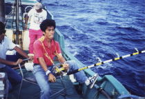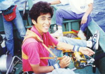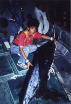 毎年6月になると紀伊半島の沖に黒潮が接近し、水温も25℃位に上昇します。その黒潮に乗って、カジキがやって来ます。紀伊半島の沖で釣れるカジキの中で最も多いのが、クロカジキ(ブルーマーリン)で中には400Kgを越えるものもいます。その他にも、シロカジキ(ブラックマーリン)それに、バショウカジキやフウライカジキが釣れる事もあります。三重県の錦には、トローリングでカジキを狙う事の出来るチャーター船もあり、毎年シーズンになると予約でいっぱいになります。私も以前、シイラのボートプラッギングが流行った頃、クラブメイトとシイラを狙ってよく、錦に通ったものです。1994年の9月にも、シイラのキャスティングで6人でボートをチャーターし、錦沖へ出港しました。この日は、私とクラブメイトの浅井啓司氏、それに100オーバークラブの永井誠一氏の他で、キャスティングとジギングで出港しました。午前中に既にシイラの入れ食いを堪能し、そろそろ錦港へ向けて船を走らせていたのですが、その時自分で作った自信の白蝶貝とアワビの8面貼りトローリングルアーを試したくなり船長にお願いしたところ、80Lbテストのロッドで曳きながら帰ろうと言う事になりました。