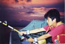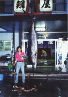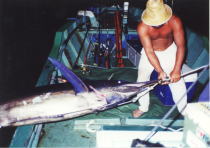 ヒット!」の声に一時は船上がパニック状態に。私もロッドポストからロッドを抜いたものの、この船にはファイティングチェアーが無く、しばらくはロッドを抱え込んでのファイトとなってしまいました。その内クラブメイトの浅井氏が、ビール瓶箱と鍋のふたで、即席のファイティングチェアー?を用意してくれました。しかし、揺れる船の上でのファイトは想像以上に大変で、何度も転んでしまいました。ラインは一気に500メートル程出され、遥かかなたでカジキの跳ねるスプラッシュが見えました。船長は、ラインの方向を見ながら巧みに操船していましたが、その内ラインの出が緩くなりピタリと停まってしまいました。どうやら、このカジキは深く潜り過ぎて水圧死してしまったらしく、全く動かなくなってしまいました。これが、よく言われる「カジキの自殺」ってやつか・・・?聞く所の話によると、カジキはプライドが高く自分の最後を敵に見られたくない為、海中深く潜って自殺するのだとか・・・。魚探を見ると、水深は約900メートル。ラインは尚も500メートル程度出ていましたが、考えてみば水面下500メートルにカジキが宙づりになっている訳で、80ポンドラインで巻き上げるとなると、大変なファイト(作業)となってしまったのです。カジキには、浮袋が無く死ぬと沈んでしまう為リールを巻いて引き上げるこなると、ハンドルを半回転づつ巻き取りながら徐々に、引き上げないと簡単にラインが切れてしまいます。ヒットしてから、既に1時間以上経つのにカジキは以前、宙づりの状態。その内うるさい乗組員?からのブーイングの声が・・・(腹が減ったとか)船酔いしていたT氏からは‘やっと帰れると思ったのに’とか、N氏からは‘根がかりしているのと違うか’とか最後には‘切れればいいねん’とか、ブーイングの嵐にあってしまいました。私も、ラインが切れてカジキを逃がす事にさほど惜しくは思わないのですが、何と言っても精魂込めて作り上げた白蝶貝とアワビの8面貼りルアーを失いたくなかったのです。2時間が過ぎ3時間が過ぎ、私も体力の限界に来ていました。振返るとうるさい乗組員達は、キャビンで熟睡状態。そして、日もすっかり暮れた3時間45分後、ショックリーダーを尾ビレに巻いたカジキが水面に姿を現したのです。すると、再び船上はパニック状態に。‘早くギャフ持って来い’とか‘でかい’とか‘写真撮れ’とか言っている間に、怪力で有名なN船長がビル(角)を掴み引き摺り挙げたのです。うるさい乗組員達とも握手を交し、‘良くやった’と祝福され錦港へと帰港したのでした。計量すると、120キロあり、船宿で魚拓まで取って頂きました。私もうるさい乗組員達に、3時間45分のファイトに付合ってもらったと言う事で、帰りに食事をご馳走しました。しかし、つい先日永井誠一氏とその話をしていたら、その時は‘ラーメンしかおごってもらっていない’と、突っ込まれてしまいました。チクショーよく覚えとる。(汗)