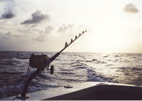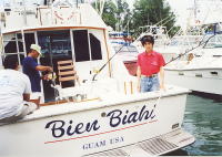 この日は、グァムゲームフィッシュアソシエイション会長の所有するビエンビアヒ48フィートでロタバンクを目指していました。途中、後部から50ポンドのトローリングロッドを2本セットし、自作のトローリングルアーを試していました。タモン湾を出て進路をロタバンクに向けたとたん、ストライクがあり早速マーリンとのファイトが始まりました。それも、岸からさほど離れていない様な場所でヒットとは・・・さすが!グァム島の海。と思いやジャンプと共にバラシ。気を取り直し、再びトローリング