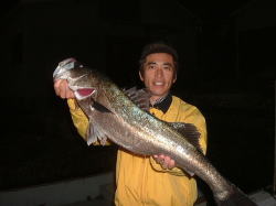 先ず、ベイエリアと言う場所をよく分析してみると分かりますが、ストラクチャー(隠れ家)に困る事はありません。ストラクチャー定着型になっているシーバスにとっては、着き場は無数にありますが一つ言えるのは、シーバスの群には個体差があり、大型シーバス程警戒心が強く、したがって大きいストラクチャーの少し深い場所を好んで着いている様です。(ダイバーによっても目撃されている)逆に、ベイエリアに特に多い小型のシーバス程、表層近くに複数の群でしかも警戒心も薄い為釣り易い(釣られ易い)と言う事が言えます。けれども殆どのアングラーは、先ず最初に表層近くにいる活性の高い小型のシーバスを釣ってしまう傾向があります。(ガイド船の船長の話)はっきり言って、これがランカーシーバスに巡り合えない一番の理由なのです。具体的に説明すると、表層近くにいる小型のシーバスを食わせてしまうと、一段深い層に着いているランカーシーバスにプレッシャー(警戒心)を与えてしまいます。普通でも警戒心の強いランカーシーバスに更にプレッシャーを与える結果となってしまいます。したがって、ランカーシーバスを狙うのであれば、表層にいる小型のシーバスを無視し、直接大型のシーバスに勝負を挑まなければ何時まで経っても小型のシーバスに遊ばれるだけで、ランカーサイズに巡り合う事が出来ません。分かり易く言うと、活性の高い小型のシーバスに気づかれない様に、しかもランカーシーバスにしっかりとアプローチする事が大切です。先ず、ランカーサイズの潜んでいそうなストラクチャーを探します。潜んでいそうなと言うと、流れの中にポツンとあるシーバスやパイプライン又は大きな橋脚等、目で見えるストラクチャーの他にも川の河口に見られ、チャネルや水没している根等があります。そして、これらのストラクチャーの中でも極力攻めにくい(攻められていない)様なスポットを絞り、次にこの様な手強い場所を攻略出来る様なルアーをセレクトします。表層にいる活性の高い小型のシーバスならば、7〜11cm位のミノーかバイブレーションルアーで充分狙えますが、潮流れの速い場所や深場を狙う場合はワンサイズ大きい、しかも深いレンジまで攻略出来るルアーを選ばなくてはなりません。最近では、金属製バイブレーションルアーやソルトウォーター専用のジグヘッドを付けたソフトルアー等もあります。しかし、この様なランカーシーバスが必ず活性(食い気)があるとは、限りません。むしろ、活性のあるシーバス程表層近くに浮上し活発に餌を追っています。逆に活性が落ちるとボトム近くで障害物にタイトに身を寄せている場合が多い様です。そこで、この様なシーバスにも口を使わせる様なルアーとテクニックが必要となる訳で、要はボトム近くにいるであろうランカーシーバスにしっかりとルアーをアピールする事です。また、水の抵抗の少ない細いラインを使って、さらにルアーを深く沈めるのも一つですが、この場合、完璧なラインシステムと微妙なドラグテンションを生かしたファイトの仕方が必要です。それに一番大切な事は、もともと数の少ないランカーシーバスを狙うのであればリスクを恐れない事です。その場・その時の状況を鋭く判断し、最後はアングラー自信の忍耐にかかって来ます。そして、見事に運良くランカーシーバスを手にする事が出来たら、そのシーバスと自然に感謝しダメージ無く上手くリリースする事も大切です。そのサイズのシーバスが、どれくらい少ない貴重な魚かと言う事もランカーハンターなら、知っておかなければなりません。