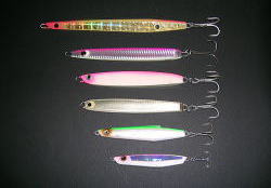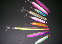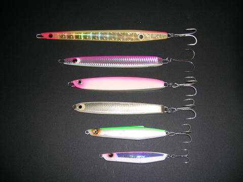よくある質問の中に「ルアーの色って関係あるの?」と聞かれますが、この質問にはいつも「多少は・・・」とか「ある程度は・・・」としか返事のしようがありません。と言うのもよく釣れる時には、ほとんどの色のルアーに食ってきますから・・・。それでは、メタルジグの色って関係ないのかと言うと、そう言う事でもありません。昔からよく「魚は色盲だ」と言われます。しかし、色盲と言っても人間が昔の白黒テレビを見るように見えるかと言うと、これだけは違うと言えます。たとえば、サケ科の魚は産卵が近くなると雄は鮮やかな赤味を帯びた体色へと変身します。いわゆる婚姻色というやつで、体色を変える事によって雌の感心を引き、産卵行動へと導くわけで、明らかにサケ科の魚は、ある種の色に特別に反応する様です。その証拠に、スウェーデンのABU社やベーテ社、アメリカのジョンソン社がサケ・マス用に製造している(スプーン)にはほとんど(赤)もしくは(オレンジ色)のセルロイドの小さな板がスプリットリングにフックと共に装着されています。この事から見ても、サケやマスが赤系の色になんだかの反応を示す事に間違いないと思われます。それでは、ジギングの対象魚として人気の高い、ブリやヒラマサは何色に反応するかと言うとこれは大変難しい事で、まずブリやヒラマサには婚姻色はありません。それに、ブリやヒラマサの泳ぐ水深は、深いところでは100メートル以下と言う事です。ダイビングをしている人なら分かると思いますが、いくら透明度の高い沖縄のような海でもほんの10メートルも潜れば、ほとんどの色はまわりの色に同化し、よほど近くで見ないとその色を識別する事は出来ません。