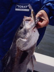 そう言った意味では、ラパラ社のオリジナルフローティングルアー(シャッドラップラパラ)は、最高のアイテムと言えます。シャッドラップラパラは全てフローティングモデルでミノータイプと言うよりは、シャッド(小型の平たい魚)をイミテートしたルアーです。タイプは、ロングリップのディープダイビングモデルと少し変わった形状のリップが付いたシャローランナーがあります。オカッパリのバスアングラーには欠かせないアイテムで、中には‘掟破り’のルアーとまで呼ばれているくらい野池のバスはよく釣れます。しかし唯一の欠点は、軽い為に飛距離が出ないのとベイトリールでは投げずらいと言う事です。そこで、この「シャッドラップラパラ」のウェイトアップ方法をこのホームページを見た人限定でお教えしましょう。(他の雑誌にも書いた事は1度もありません)先ず、ノーマルのシャッドラップラパラを分解してみると分かりますが、丁度腹側にあるヒートンの真上に円筒型の鉛が入っています。バラストが円筒形をしているのは、このシャッドラップラパラくらいではないかと思います。このバラストは浮力と重力との上下バランスを保つ他に何とスイミングの最中に前後のバランスをもとっているのです。前後のバランスとは、リップに水の抵抗を受けて傾いた際に上に起き上がろうとする浮力を使って、後部と前部にアクションを伝える訳で、よく観察すると中心(バラストの入っている位置)から前部もアクションしている事がわかります。その為に、円筒型のバラストが入っていると思われます。これが「シャッドラップラパラ」のメカニズムで、ルアーにウェイトアップする場合2つの方法があります。一つは、ボディに穴を空け粘土オモリか鉛を埋め込む方法です。先ず腹部にリューターで5mmの穴を空けますが、5cm以上のモデルであれば7mm位の穴迄空ける事が出来ます。穴の深さは、せいぜい5mm位迄であまり深く空けるとボディそのものが破損する怖れがあります。画像を見て解かる様に、左右対称では無くぐいちに鉛を埋め込みます。鉛を埋め込んだ後は、エポキシを流し込んで固め乾いたところで、カッターで面一にし更に白のエナメルでコーティングして出来上がりです。一つの穴に平均1.5グラムのウェイトを入れたとすると4ヶ所で6グラム重量が増えた事になりますが、キャストする際6グラムのウェイトアップがどれくらい投げ易くなるかは、使えば分かります。もう一つのウェイトアップ方法は、これも画像を見て解かる通りリップの裏側に粘土オモリか、もしくは削り出しの鉛をエポキシ接着剤で貼り付けます。このタイプのルアーは、リップの裏側に直接水の抵抗はかかりません。しかし、一度リップで捕まえた水を左右に逃がす際に多少のロスが出る事は確かです。それに、前部に重量が増す為アクションも幾分悪くなりますが最大で7cmのシャッドラップラパラを10グラムウェイトアップする事が出来ます。この様に、ルアーをチューニング出来るのはラパラがバルサルアーであると言う事でバルサ程加工し易いルアーはありません。それと、ラパラがよりバランスの取れた市販ルアーである事です。この他にも、様々なルアーのチューニング方法がありますが知っておかなければならないのは、チューニングすると言う事はある意味でそのルアーの機能を壊す事にもなると言う事です。車のチューニングでも全く同じ事が言えますが、トータルバランスのとれた車程安心して乗れる車はありません。しかし、一度最高速度を上げるとなると、それなりの改造が必要となります。チューニングの度合いが増せば増す程、車としては乗りにくい車へと変わってしまうのです。私の様に、加速性ばかり求めたマシンを作って高速でコーナーをきった為に、とんでもない事になった例もありますが、ルアーも同じでチューニングの度合いが増せば増す程、泳ぎの悪い使い難いルアーになってしまう事も忘れずに。