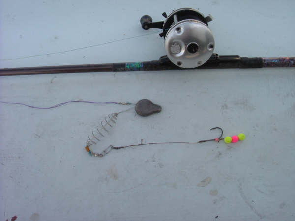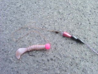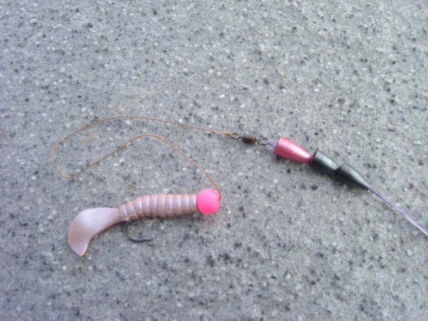 次にそれぞれのソフトルアーをどの様にしてコイにアプローチさせるかで、私の場合は、20センチ程のリーダーを付けたキャロライナリグを使用しています。テキサスリグだと、コイが食い付いた時に違和感がある為か、フックアップの確立は極端に悪く、又、小さいソフトルアーを使う事は出来ません。タックルはバスタックルの代用で充分ですが、ロッドは出来れば食い込みのいいグラスロッドが使い易く、カーボンロッドだとティップが硬い為か、バイトした時に違和感を与える様です。ラインは、PEの2号か3号くらいが使い易く、出来るだけ水の抵抗の少ない細いラインがアタリを取るのには最適と言えます。
