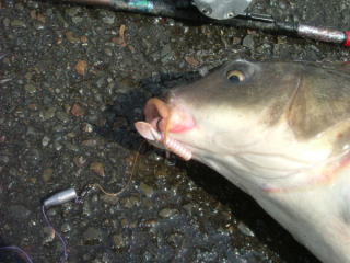 次に問題のルアーとなりますが、コイが嗅覚に優れている事から、当然集魚剤の良く効いたソフトルアーが良い様です。私の経験から言うと、同じワームでも、集魚剤の入った物と入っていない物とでは比べ物にならないくらい集魚剤入りの方がよく食います。しかし、ここで注意しないといけない事は、カーリィティルやリボンティルのワームを使う際に、必ずテイル部分を一部カットし、動きを鈍くする事が大切です。元々コイは、あまり動きの激しい物を好みません。これは動きによく反応するブラックバスやナマズと違う点です。逆に臭いや味覚にはブラックバス以上に反応する様です。ストレートワームや小型のイミテーションワーム、あるいは球状のソフトルアーを使う場合は、その必要はありません。狙い方としては、まず泡付(コイの捕食行動)を見つけ、泡付の泡の動きをよく観察し、上流からそっとリグ(仕掛け)をキャストし、水底に付くとラインを少しフカセ気味にしてアタリを待ちます。アタリは以外に小さく、ロッドチップに神経を集中していないと見逃す事もよくあります。いくら集魚剤入りとはいえ、ブラックバスの様に長い間、咥えている事はありません。ロッドチップに少しでもアタリを感じたら、取り合えず大きく合わせる事です。しかし、PEラインの強度を考えていないと合わせ切れする事もあります。
