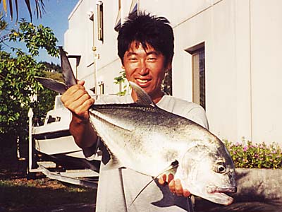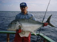 写真はモルディブ ファーフアトールにて 38Kg PM3:00頃(現地時間) 南マーレーオルベリからの移動でファーフに着いて、東側のアウトリーフの潮の流れが速い水路でペンシルを引くと3匹同時にチェイスで、残念だけどその中の一番小さいのがヒット。それでも、このサイズだった! |