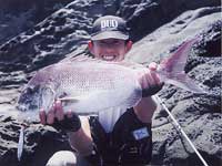 きっかけ:小学生のころ150円ぐらいの、子供用の簡単な仕掛けを買ってきて、竹の竿にくくりつけ近くの川へ行き、ミミズを針に付けて魚のいそうな所へひょいと投げると、すぐに食いついてくる。まさに入れ食い。20cmもこせば大物だった。 そんな事から20年たったある日の事、福島氏とルアーフィッシングというものに出会った。昔の記憶があるのでかなりなめていた部分もあった。釣なんて針にエサつけてひょいと投げれば魚が食いつくと…。 海は魚の種類も多いし。大物釣るぜと始めたが、現実の厳しさを知る事となる。 |