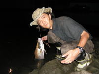 午後3時ごろからキャストを開始、6時を過ぎた頃にようやくヒット! 小型のアカメでしたが、よくファイトしました。 写真撮影後、タグを付けてリリースすることが出来ました。 (詳細はメンバー専用ページで。要パスワード!) |