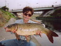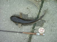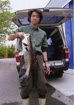 この日は仕事の帰りに、いつものファミレスで藤岡氏と待ち合わせをし、午後からの潮の引くのを待って、藤岡氏おすすめのポイントに入りました。必殺のフライで釣ったコイ(91センチ)は日本記録に200g足りませんでした。藤岡氏は約30分のファイトの末、1メートルくらいのソウギョをGET! | ||