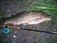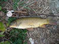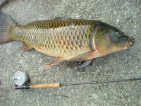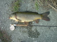 久しぶりに実家の長浜に帰ってきました。 近所の水路でコイをフライで狙いましたが、水温が下がっていた為か反応が悪く、食 わせるのに大変苦労しました。 最後は、松浦さんにもらった必殺のウェットフライで何とか二匹のコイをゲットする ことが出来ました。 |