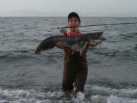 9月11日早朝某河口にて・・・ヒットしたときはスズキかと思ったけどメーターオーバーのアカメでした112cm23キロ何とか無事リリース! いやー疲れた! |