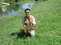 ここは、コイ・雷魚・バス・ブルーギルなどが釣れます。 当日は、雨の後で濁りが入っていた為、コンディションは良くなかったのですが、水草の近くに浮いているコイをサイトで狙った結果、6匹ゲットする事が出来ました。 雷魚は、2回バラシで終わり。 |