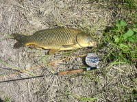 午前8時頃から奈良県の大和川にコイを狙いに行ってきました。何と自宅から20分の場所で、数匹のコイの群れを発見。ドライフライは、ほとんど食い気が無く、松浦さんにもらった「必殺ダンゴムシフライ」で三匹をゲット。途中から、濁った水が流れた来た為、しかたなくオフとなりました。 | ||