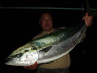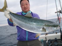 当日は客さんと私で出船!小さいながらも鳥山発見!ボイルも出てお客さんがベストポイントにキャスト!私は遠慮しながら逆方向へキャスト!水深40mのはず?サミングしながら着低をうかがうが、ラインは150m以上出て行く?「ん!?」とリールのべールを返し、しばし?船が少し進んでいるせいかなぁ〜と思いながら、一応フッキング!「まさか!」とポンピングするとその「まさか!」である一度ならず二度までも、同じお客さんに鰤をすくってもらう訳には・・・、しかし、お客さんが「遠慮せんと!」と言いながらすくってくれました。その後はアタリもなく長い一日が過ぎ、そっとお客さんのクーラーボックスに鰤をしのばせたのは言うまでもない。 めでたし! |