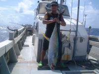 7月9日から11日にかけて久米島へキハダマグロを狙いに行きました。 9日、10日はルアーへの反応が悪く、10日の午後からは餌釣りに挑戦! PM2時半ごろに待望の大型キハダマグロがHIT! 約30分のファイトの結果、手にした魚は50キロには少し届きませんでしたが、満足のいく魚でした。 11日は飛行機の都合上、午後1時までの釣りとなり、再びルアーで挑戦しました。 朝一はトップで数を出しましたが、サイズが伸びず、その後、魚探の30〜120mに反応があったため、ブランカ150gを投入。小型を数匹キャッチした後、なんとか10キロオーバーのメバチを釣ることが出来ました。 |