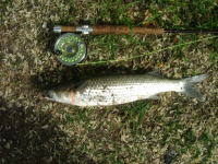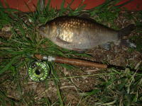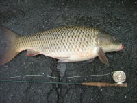 早朝に前から目をつけていた橋のたもとのコイを狙ってみました。 練り餌をチャミングし、餌についたところで、練り餌そっくりのグローバグ(スイミー色)を水底にタッチダウンさせ、吸い込むのを見てフックアップさせました。 あまりスマートなフライフィッシングとは言えません。 |