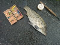 実家の近くのいつもの水路に、久しぶりにフライロッドを持って出かけました。 この日は、雨の降った後で少し濁りが入っていましたが、浅瀬にいる活性の高いコイをウェットフライで釣ることが出来ました。 |