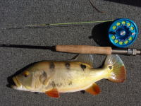 ウィルソン湖のピーコックバスに挑戦しました。 当日は雨の影響から濁りが入っており、水温も低く、状況は良いとは言えませんでした。 開始早々にHITしたのですが、ラインブレイク。その後は時たまチェイスはあるものの、沈黙・・・。 ガイドの指示で、ストラクチャーのキワを狙って投げ続けること数時間、太陽が高くなり水温があがったのか、ついにHIT! 引きが思いのほか強くて、驚きました。 その後、アシとゴミ溜まりの複合エリアで2本追加しました。 フライをタイイングするときに、ウィードガードをつけるか迷ったのですが、面倒くさいのを我慢して装着しといてよかったです。 |