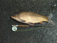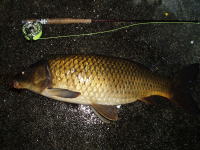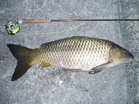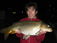 午後8時から、松浦さんの案内で某運河の温排水周りのコイをフライで狙ってみました。 チャミングすること約2時間半、やっとの思いでフックアップに成功! ここのコイは滋賀県の水路と違って、かなりナーバスで、手強い相手でした。 |