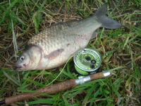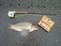 ひさしぶりに、実家に戻った際、ドライブがてらにフライロッドを持って西ノ湖周辺を探索しに出かけました。 水路のたまりにまるまると太った大型のコイが数匹群れているのを見つけ、ウェットフライを使って、ようやく食わせることができました。 あまりの太さにびっくりして笑ってしまいました。 |