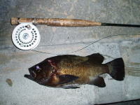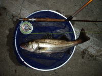 今年も、藤岡氏の実家のメバル釣りに行ってきました。PM6時ごろから、湾沖にある浮筏にボートをつけ、集魚灯をつけてイカナゴの集まるのを待って、小型ミノーとワーム、それにフライで狙いました。 今年は例年よりメバルの寄りが悪かったのですが、それでも、3人でン百匹(20cm以下はリリース)画像は、松浦さんがフライで釣った29cm。 |