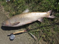 5年前に藤岡さんと行ったポイントへ久しぶりにトライしてきました。 流れ込みに食パンをチャミングしたところ、すぐにコイとニゴイが反応。 1匹目のコイは61cm。 2匹目にヒットしたのは、何とこのソウギョでした。 |