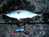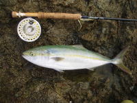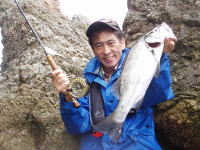 この日は急激に発達した低気圧のため、北西から西の風に変わりました。波の高さは2.5m後3m、10数年前からルアーでトライしていたポイントにフライロッドで挑んでみました。3投目に80cmクラス? をヒットさせたのですが、ランディング寸前で惜しくもバラシ。結局、足元で食わせたこの一匹だけでした。 | |||||||||