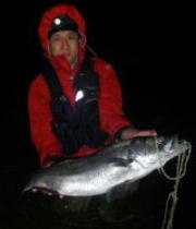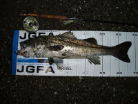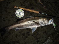 夜間に潮の下がるのを待って、新淀川にウェーディングしてきました。 駆け上がりにそって、フライラインを斜めにトレースしたところ、5バイト有り、そのうち2匹をキャッチする事が出来ました。 この日のベイトは、サヨリとサッパでした。 |