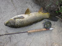 会社の出張で奈良市内にいった時に見つけた水路でコイを狙ってみました。 川底にフライを着底させて、ナチュラルに口元に近づけると、一度はためらったものの、ついに食わせる事が出来ました。 |