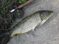 近所の水路でコイを狙ってみました。 口元にフライを近づけてもなかなか食いつかず、最後はパンを撒こうかと思ったのですが、意地で食いつかせました。 それにしてもパンゴイと違って、かなり手強いです。 |