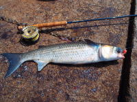 早朝からフローティングのヘッドをつけた#5のシンキングラインでダウンストリームを狙ってみました。結果は、3匹。レッドセッターのマラブーテイルパターンは今年も健在でした。昼前からルアーで少し深い場所を狙ってみました。結果は、4匹。 | |||||||||