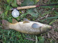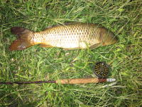 仕事の帰りに、昨年ソウギョに出会ったポイントを見てきました。 ソウギョは、見当たらなかったのですが、流れ込みの澱みにコイとフナを発見。 ニンフパターンで何とか食わせる事が出来ました。 |