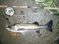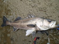 前日の雨で、かなり濁っていました。久しぶりに和歌山の釣友とシーバスを狙ってきました。明け方にウェーディングして、なんとか一匹をゲット。 ルアーで狙っていた釣友は明け方一時、入れ食っていました。 |