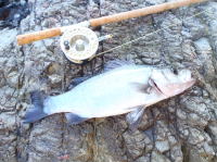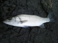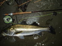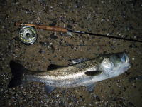 深夜、潮の干くのを待って、ウェーディングしてきました。 下げ潮の時に、ルアーで4匹。満潮に入ってから、フライで7本のシーバスをキャッチ。 雨の後で、適度な濁りが入っていました。フライは小型のホワイト系によく反応しました。 |