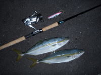 久しぶりに後輩のコバヤンと淡路島に行って来ました。 朝は波が高く天気が悪かった為、昼からの上げ潮を狙ってきました。 ナブラになかなかルアーが届かず苦戦しましたが、ハマチとエソを1匹ずつゲットする事が出来ました。 |