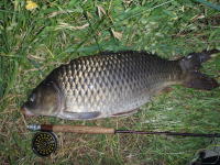 家から自転車で20分ぐらいのところで水溜りがあり、いつもコイがたまっています。 このコイはチャミングせずウェットフライで食わせる事が出来ました。 |