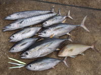 キハダマグロ7㌔を筆頭に小型は多数、カマスサワラ、ヒレナガカンパチなど楽しい一日でした。 現場はサメが多く、争奪戦を強いられます。 |