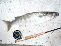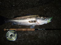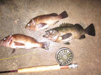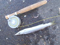 この日は南西の風があったもののあまり波気が無く、本命ポイントは不発。 同行者はルアーで80cmクラスを2本ゲット。 私はフライでなんとか50cmクラスを1匹。 ベイトのサイズがいまいち掴めず苦戦しました。 |