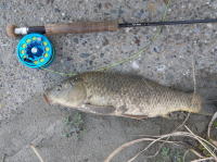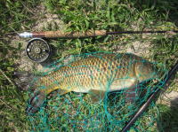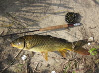 実家の用事で久しぶりに大阪に帰ってきました。天気が良かったのでBOSSに頼んで釣りに連れて行ってもらいました。途中で小林さんと合流し○○川でフライでコイを狙ってみました。フライフィッシング初挑戦で2匹のコイをゲット。けれども小林さんの大切なフライを5つも無くしてしまいました。小林さんゴメンナサイ・・・。 | ||||||||||||||||